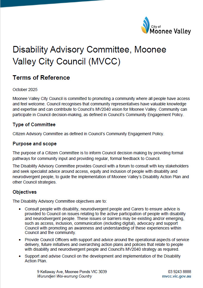 The Moonee Valley Disability Advisory Committee (DAC) was established in 2019 and provides Council with a forum to consult with community members and seek specialist advice around disability.