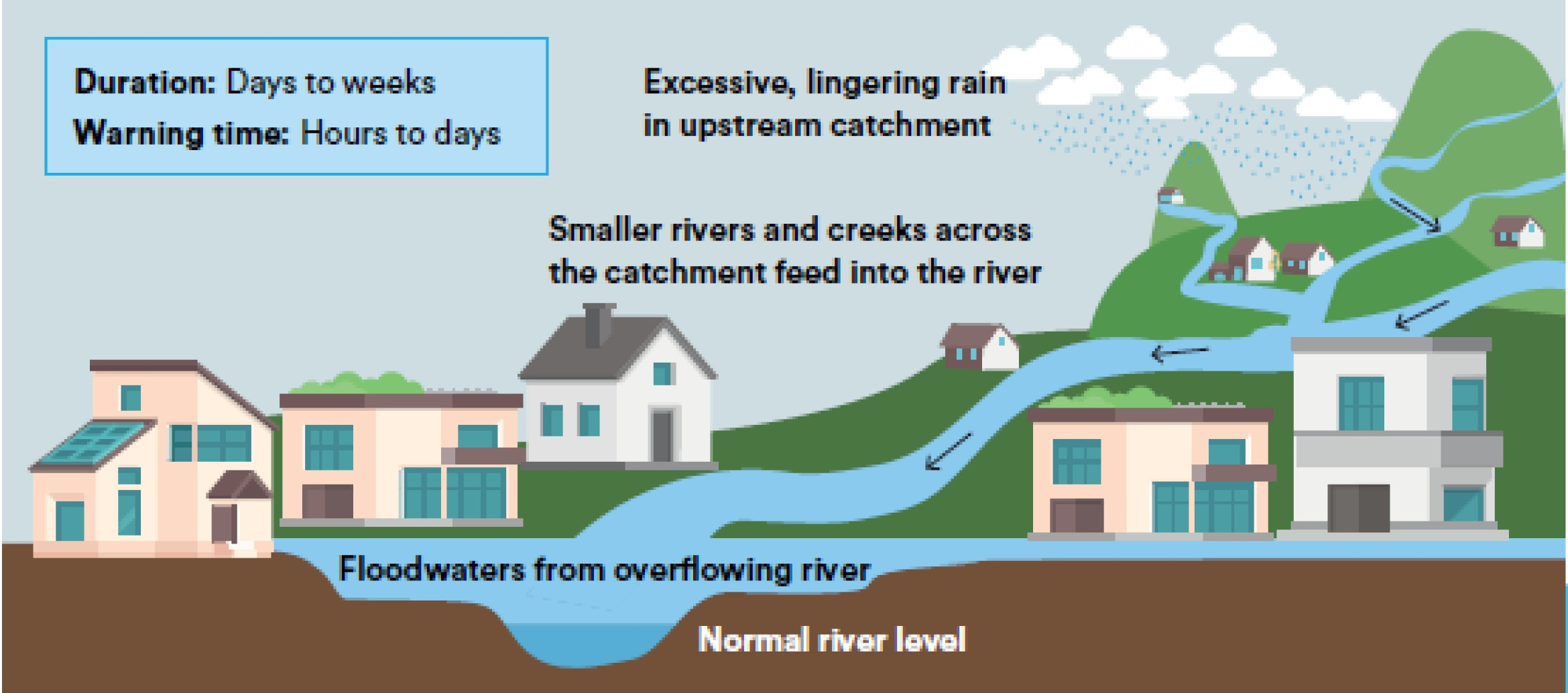 Riverine flooding happens when prolonged or intense rainfall in the upstream catchment causes rivers, creeks, or streams to rise and overflow their banks. The excess water then spreads across surrounding land, leading to flooding in areas near the river system.